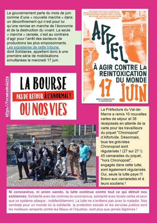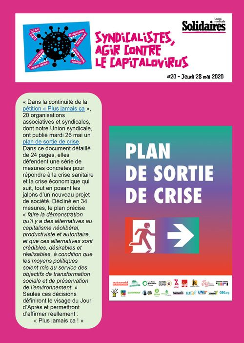 Posted in Bulletin, tract Syndicalistes contre le capitalovirus #20 – 28 mai 2020 Author: solidaires33 Published Date: 28 mai 2020 Publication ce jour du nouveau numéro de ce bulletin Solidaires.A relayer sur vos sites, réseaux sociaux, messageries,… Syndicalistes contre le capitalovirus #20 J’aime ça :J’aime chargement…Partager Author: solidaires33blog de l'union syndicale Solidaires 33 8 rue de la Course 33000 Bordeaux Tél. : 05 56 90 89 33 mail : solidaires33@wanadoo.fr