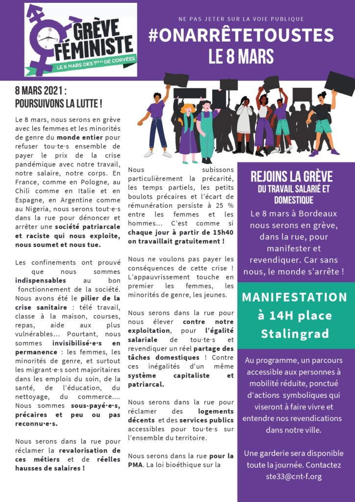 Posted in Non classé #ONARRÊTETOUSTES Le 8 Mars Manifestation à 14h Place Stalingrad Author: solidaires33 Published Date: 4 mars 2021 tract d’appel au 8 mars à BordeauxTélécharger J’aime ça :J’aime chargement…Partager Author: solidaires33blog de l'union syndicale Solidaires 33 8 rue de la Course 33000 Bordeaux Tél. : 05 56 90 89 33 mail : solidaires33@wanadoo.fr