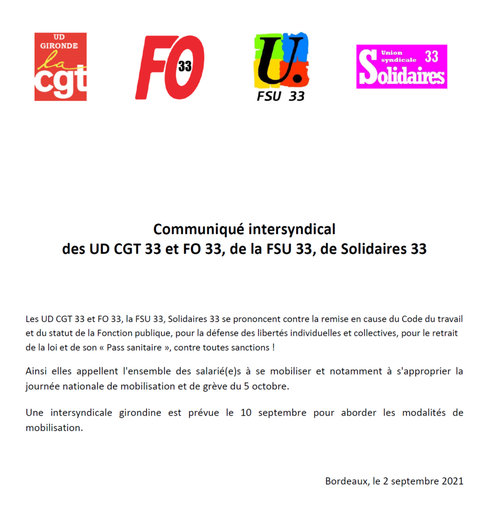 Posted in Communiqués Pour le retrait de la loi du 5 août 2021 et de son « Passe sanitaire », contre toutes sanctions ! Author: solidaires33 Published Date: 2 septembre 2021 communique_intersyndical_33_-02-09-21-1Télécharger J’aime ça :J’aime chargement…Partager Author: solidaires33blog de l'union syndicale Solidaires 33 8 rue de la Course 33000 Bordeaux Tél. : 05 56 90 89 33 mail : solidaires33@wanadoo.fr
