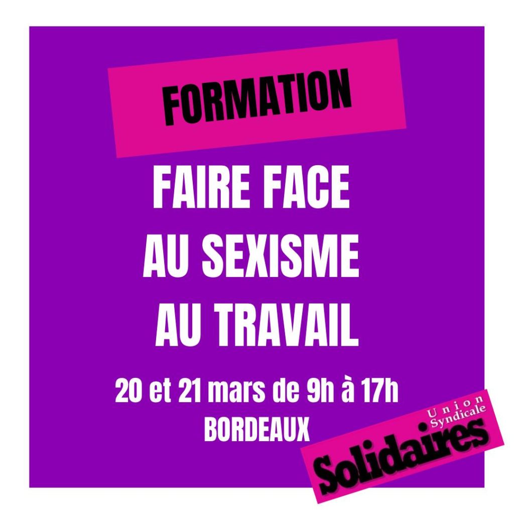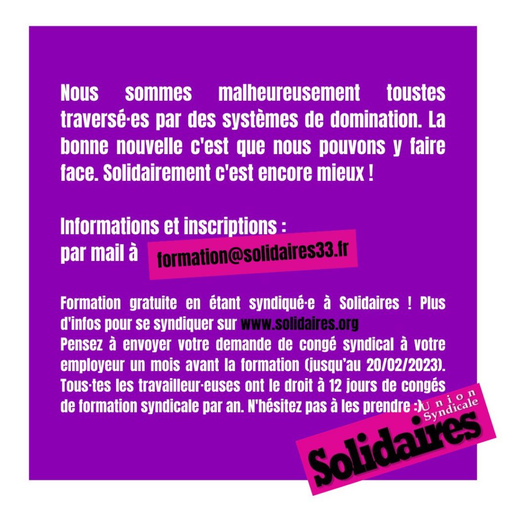 Posted in Formations syndicales Formation syndicale : Faire face au sexisme, les 20 et 21 mars 2023 Author: solidaires33 Published Date: 8 février 2023 Pensez à passer par vos correspondant-es formation quand il existe dans votre structure syndicale, sinon contactez formation@solidaires33.fr, en précisant bien à quel syndicat vous adhérez. J’aime ça :J’aime chargement…Partager Author: solidaires33blog de l'union syndicale Solidaires 33 8 rue de la Course 33000 Bordeaux Tél. : 05 56 90 89 33 mail : solidaires33@wanadoo.fr