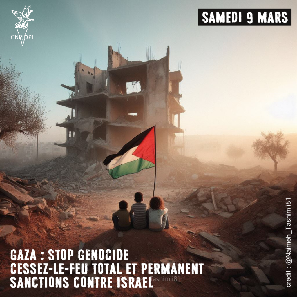 Posted in Appels et Pétitions (Appel du CNPJDPI) 9 mars : Gaza, Stop Génocide – Cessez-le-feu total et permanent – Sanctions contre Israel Author: Philippe A. Published Date: 3 mars 2024 CNPJDPI_Appel_manifestation_09_03_2024_avec_signaturesTélécharger J’aime ça :J’aime chargement…Partager Author: Philippe A.